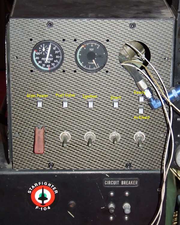 That’s what the panel looks like so far... Not yet finished, some brackets for the RPM and EGT gauge will need to be fabricated and a bleed air pressure gauge will be added in the empty hole. Yet, all the functions to get the engine running have been figured out. Since only the bleed air will be required in the installation that it’s intended for, the alternator has been removed and all the accompanying circuitry pulled. The two switches for the fuel valve and the ignition exciter are not really necessary, yet they permit testing of these accessories without actually performing a start. To start the engine, the main power switch is closed and then the start switch is pushed momentarily - that’s it! When the engine has reached governed speed, the airbleed switch can be actuated to open the butterfly valve. And that’s what’s left to do... cleaning!