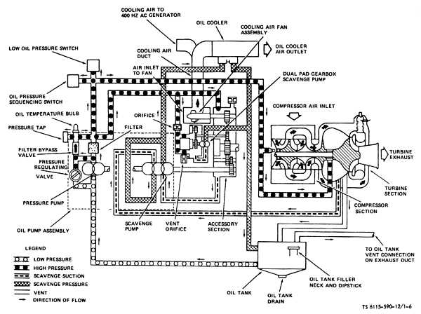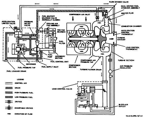 This is a schematic of the basic engine setup, also showing the fuel control unit (FCU - click the pichture for a larger version). The FCU design is typical for the early Garrett AiResearch auxiliary engines, providing RPM stabilisation by a flyweight governor, acceleartion control by compressor delivery pressure (CDP) operated differential pressure valve that’s also used to limit EGT in case excessive load is applied. The bleed air valve is also EGT-controlled by a pneumatic thermostate that operates at a slightly lower temperature than the FCU control thermostate. This configuration makes it possible to open the bleed air valve without a load attached. The butterfly valve will only open so far as not to overload the engine.