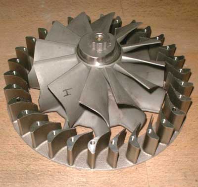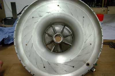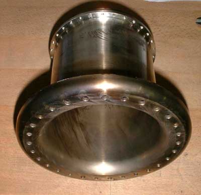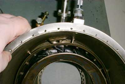 machined from solid inconel. A previous version, made from worked sheet metal, tended to warp during operation and caused turbine rubbing.