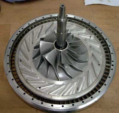 the compressor cover/bearing housing assembly. This is one of the most complicated parts of the whole turbine engine because it contains the complete lubrication system for the single hydrodynamic