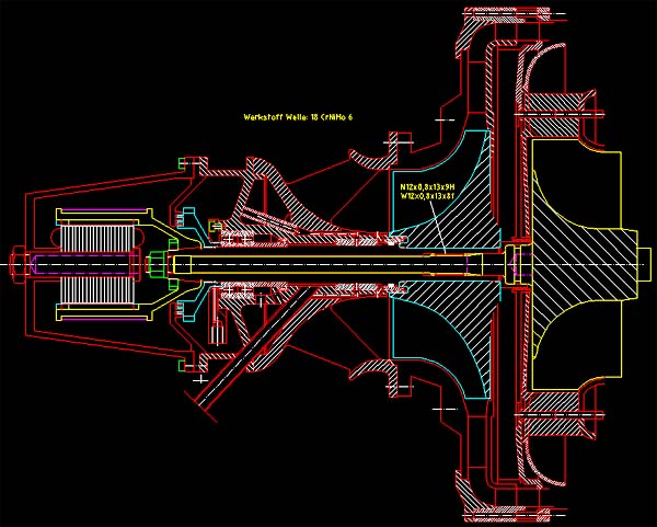 the right the two wheels are shown, isolated from each other by a heat shield and the compressor diffuser. Also a labyrinth shaft seal is placed here. The shaft arrangement is of the