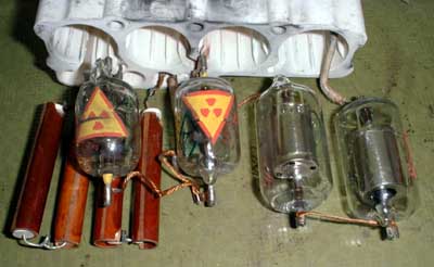 Aren’t these colorful “radioactivity” signs cute? The tubes with these signs are the spark gaps that probably contain some radioactive material to aid ionisation of the gas contained in them. I checked them with a geiger