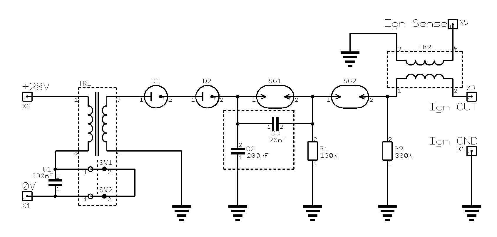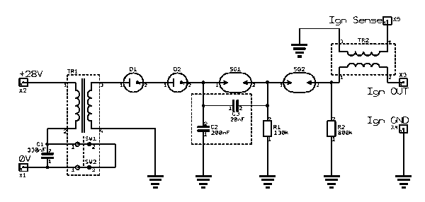 (much...) larger version. Both channels are electrically identical. TR1 is the ignition coil with integral breaker contacts. C1 is the resonance capacitor and is connected parallel to both